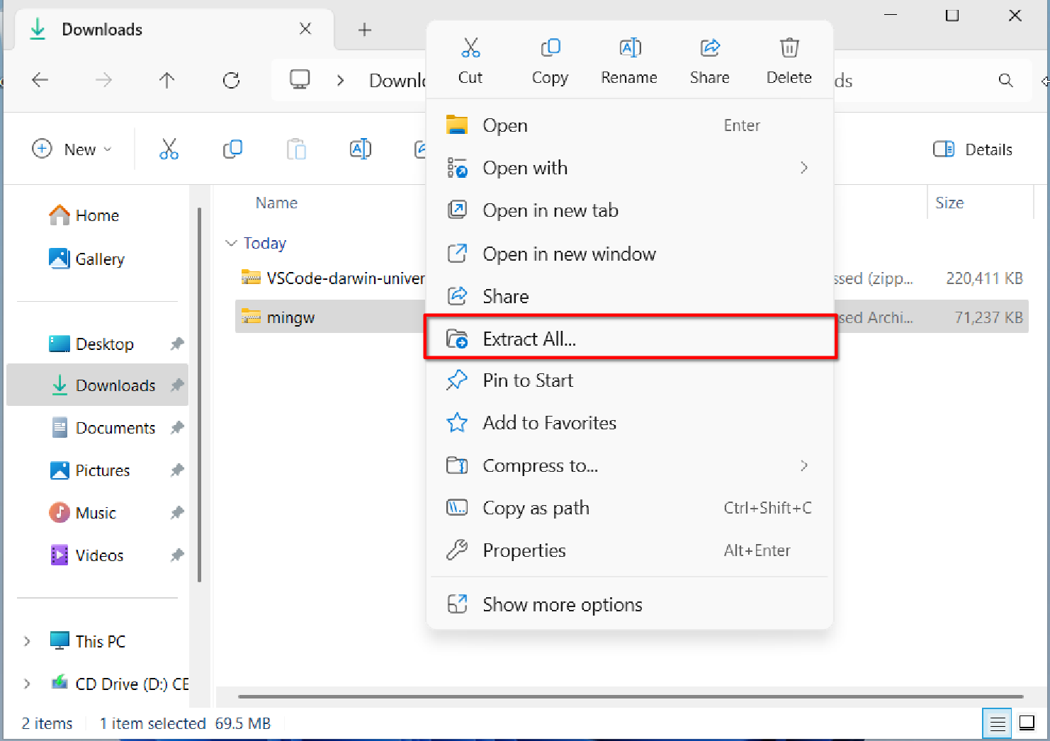 In the package, please download the file mingw.7z, and choose to right-click and extract it to your desired path (don’t just double-click to open it). Here, I chose a location under the C drive; note that you don’t need to extract it to the C drive, any path is fine, but make sure this path doesn’t include Chinese characters or spaces. For the sake of consistency in this tutorial, I’ll use $PATH$ to refer to the extraction path. After extraction, you’ll see a new folder called mingw64 in your $PATH$ directory.