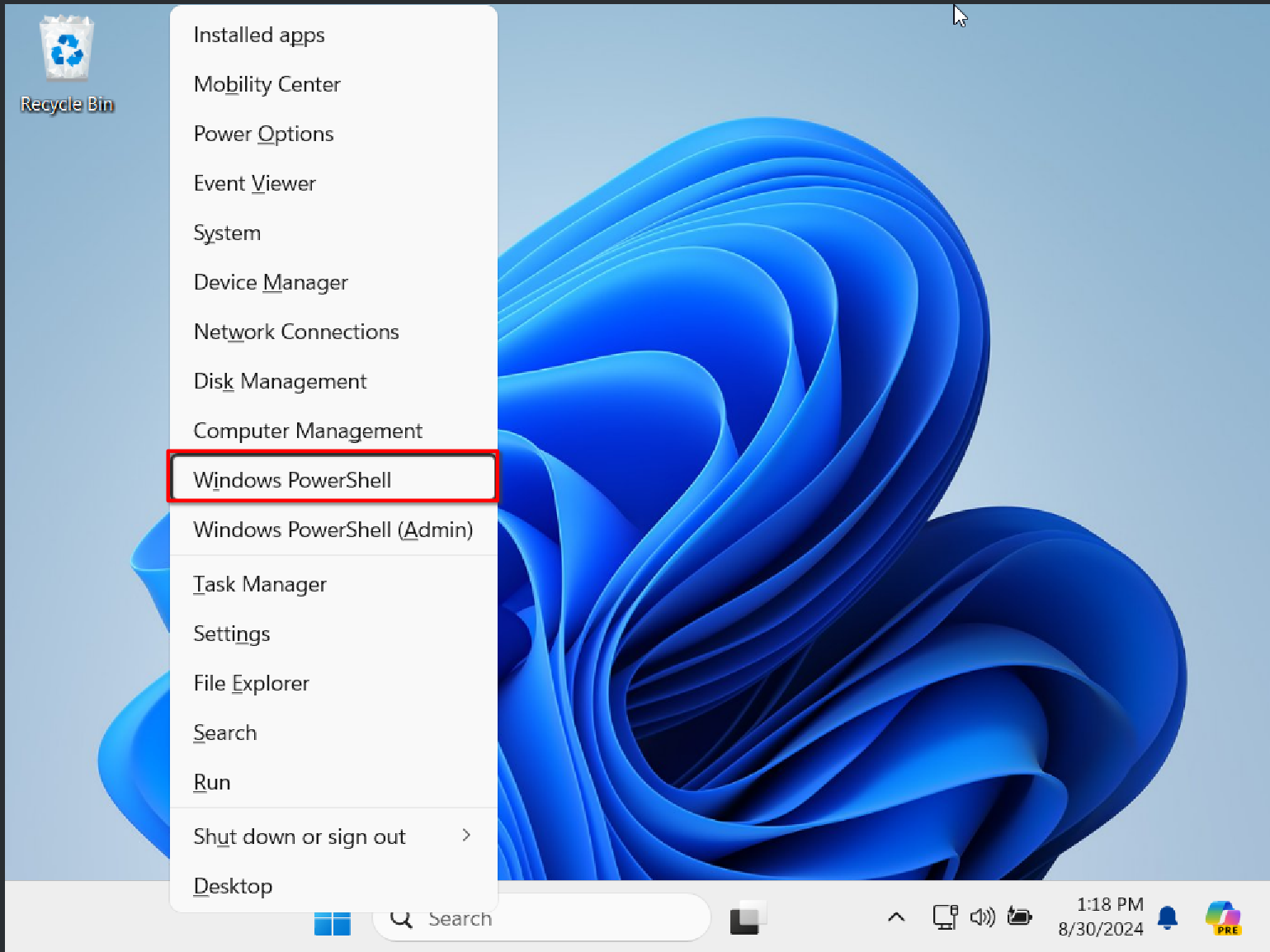 At this point, the compiler configuration is complete. We can verify if the configuration was successful with the following steps. On the desktop, press Win+X, and in the pop-up menu, select Windows PowerShell (or you can directly search for PowerShell in the search bar and click to enter)