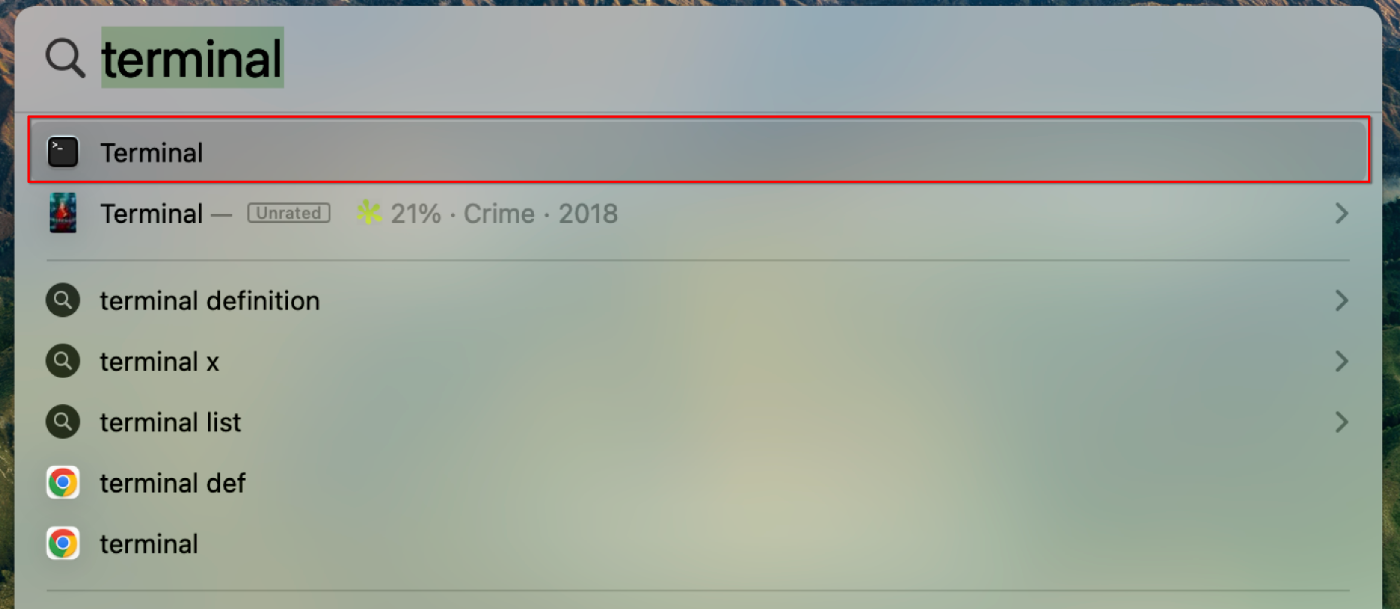 On the desktop, press Command+Space, type Terminal in the search box, and select the Terminal application.