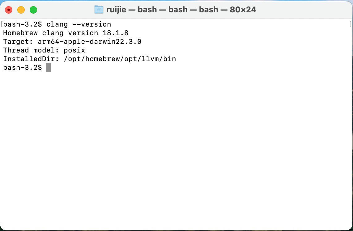 In the pop-up window, continuously select to confirm installation; after installation, type clang --version in the Terminal window, the output should be as follows (the text might have slight differences):