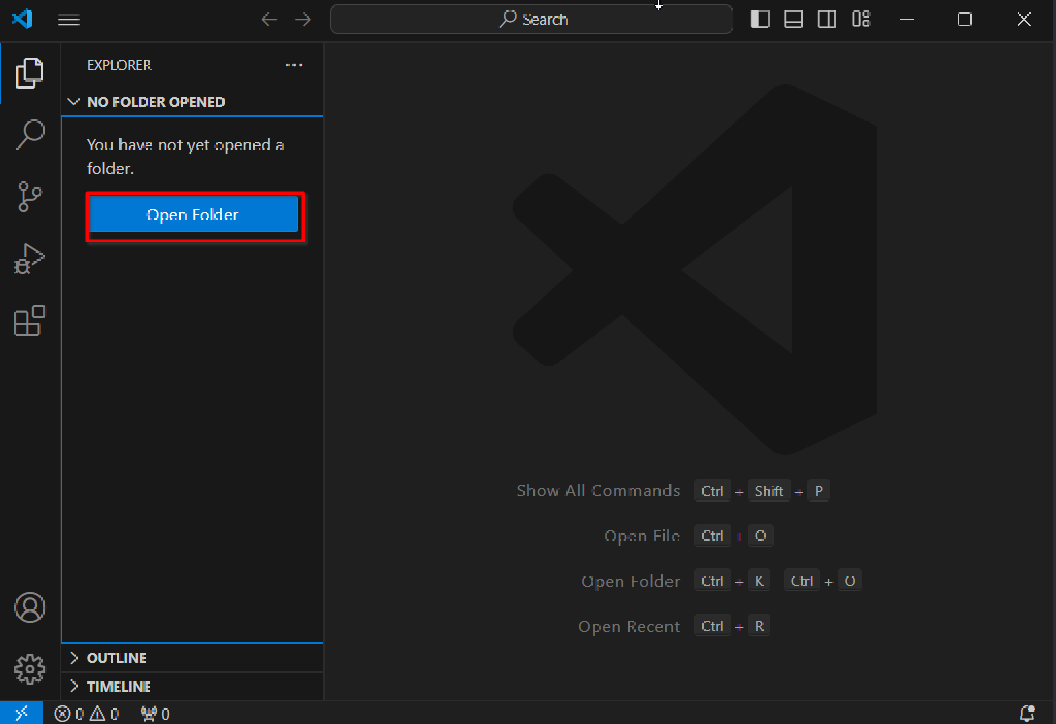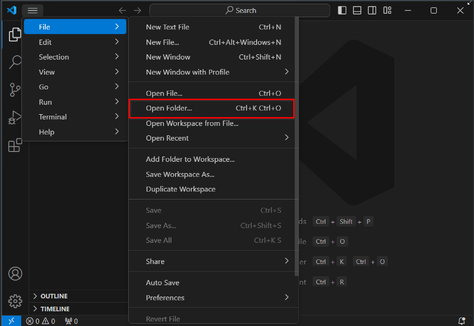 Create a new folder named helloworld in a suitable path. On the VS Code homepage, click Open Folder in the menu to find and click Open Folder/directly press Ctrl+K Ctrl+O, find and select helloworld to open.