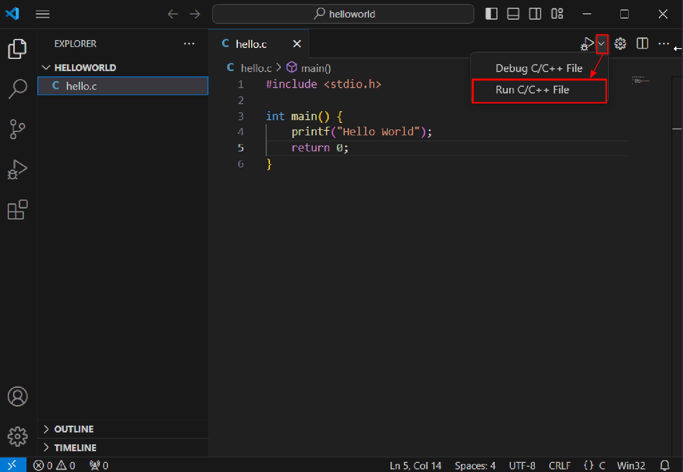 }This code will output a sentence in the terminal: Hello World!; To output this sentence, we need to compile and run this program. Click the dropdown button next to the triangle play button in the upper right corner, and select Run C/C++ File from the menu