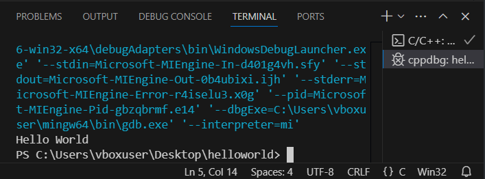 After a brief delay, two terminal windows will pop up at the bottom of VS Code; in the second window, you’ll see the expected Hello World! Congratulations, you’ve successfully run your first C language program!