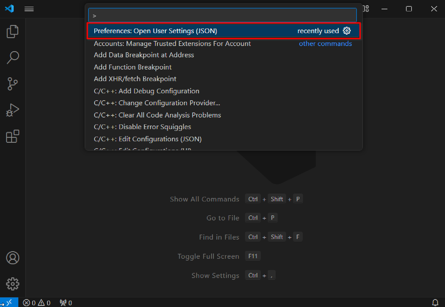 On the VS Code homepage, press Ctrl+Shift+p (Windows)/Command+Shift+p (Mac OS), in the pop-up chat box, type settings.json and select Preferences: Open User Settings (JSON) from the options that appear.