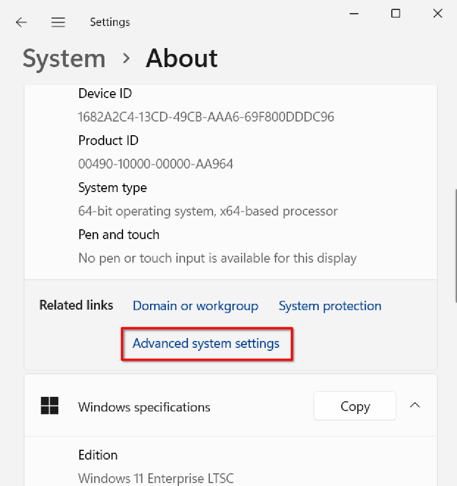 Open Settings, select System settings -> About, choose Advanced system settings