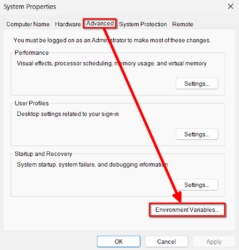 In the new window, make sure you’re in the Advanced tab, select Environment Variables