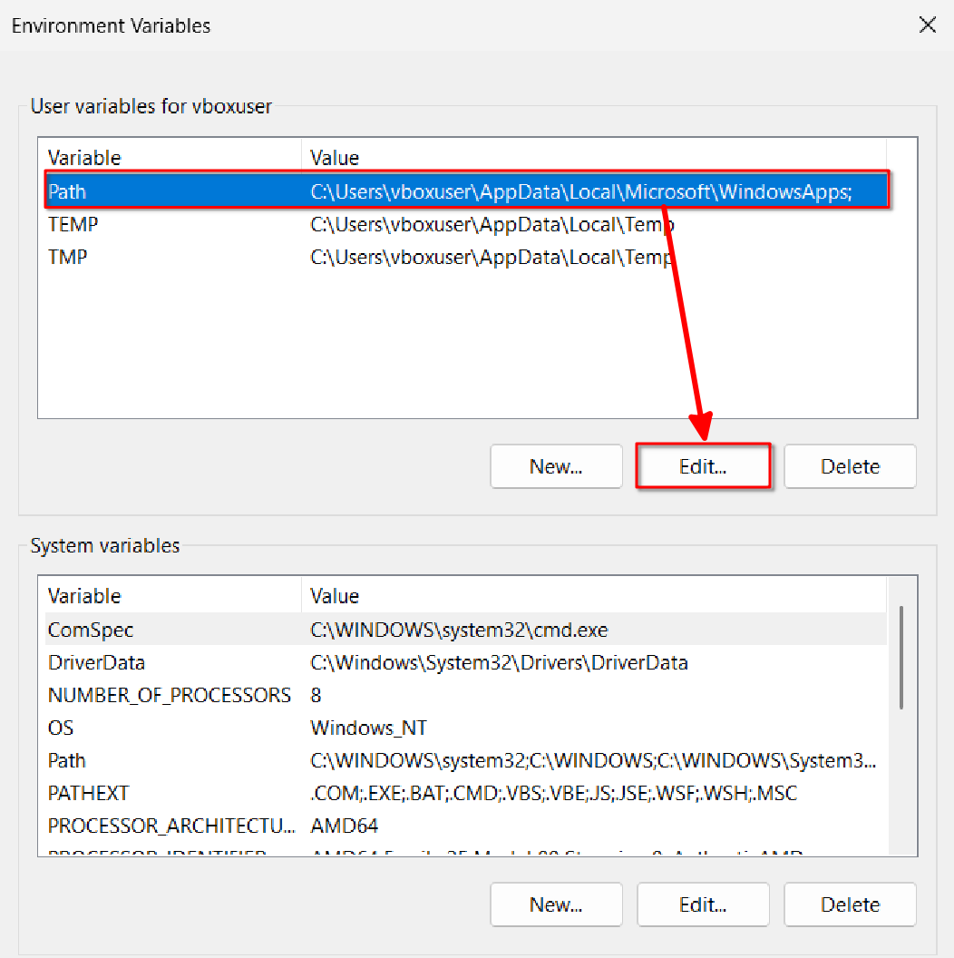 In the new window, double-click the Path row under Variables (or select Path and click Edit below)
