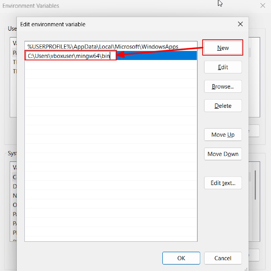 In the new window, select New on the right, and in the new blue item’s input box, type the following: $PATH$\mingw64\bin,